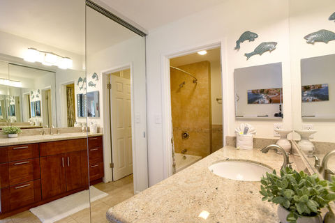This charming 2 bed, 2 bath unit is located on the second floor allowing it to have a view of the ocean from the lanai, dining room, and master bedroom. The kitchen is stocked with all the basic appliances you may need during your stay, including a toaster, blender, coffee maker, and rice cooker. Both the dining room and lanai have table seating for meals, and the living room has plenty of comfortable seating for a relaxing evening. The guest bedroom features one twin bed, one full size bed, a desk, its own lanai facing towards a garden view, a closet and its own bathroom. In the master, you’ll find a place of solitude. It has its own lanai with a view of the ocean, a closet, dresser, and a lovely stone inlaid walk-in shower. Each room has a TV and its own air conditioning unit, and the unit has its own washer and dryer within.