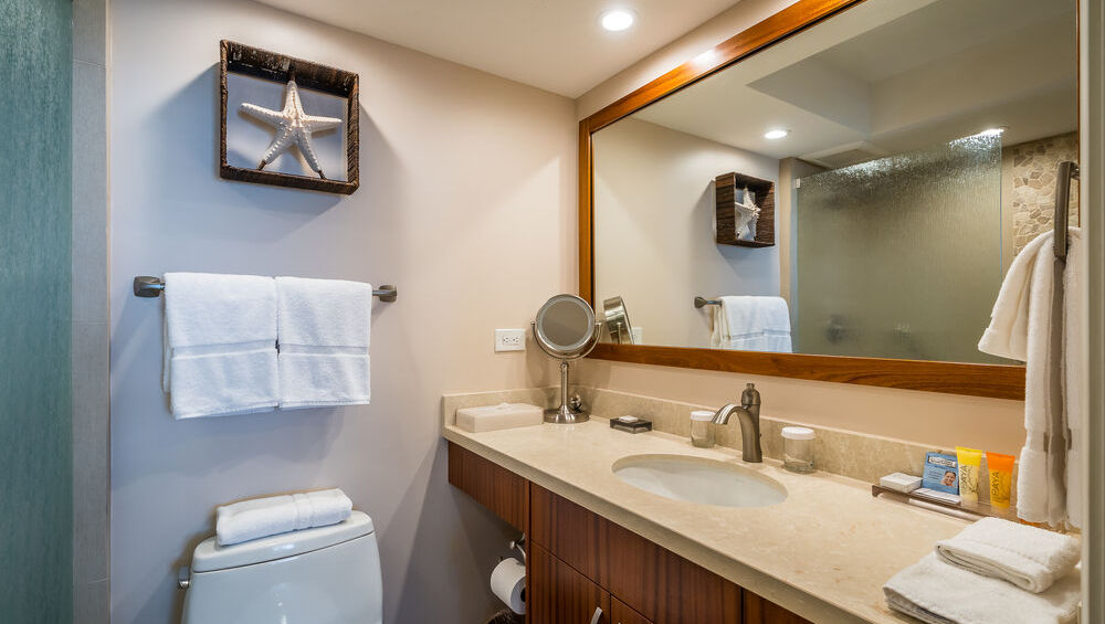 The open plan condo was designed to take advantage of ocean breezes and spectacular views. The king-sized bed is right next to the sliding glass doors that open directly onto the lanai. Taking just a few steps from bed out into the fresh air will allow you to see the peaks of Maui’s own Haleakalā National Park as well as the islands of Molokini, Kaho‘olawe, and the shoreline down from Wailea to Makena.