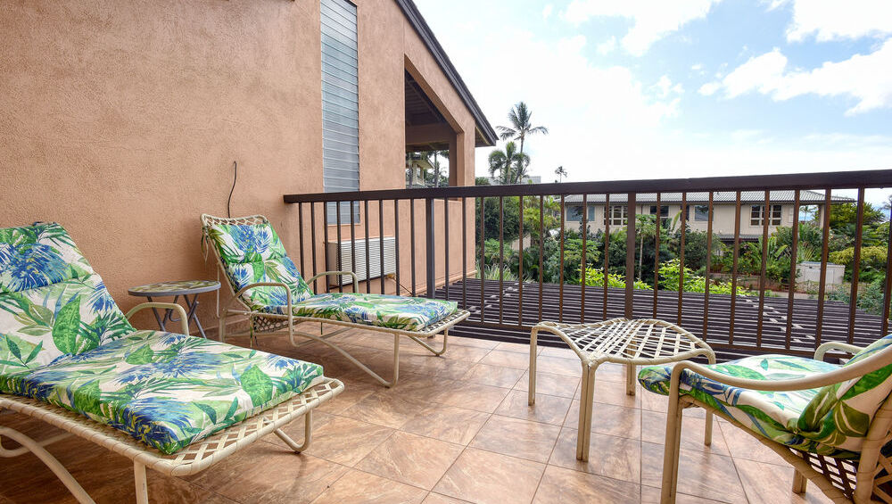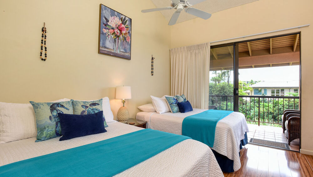 This townhouse unit, the largest layout in the complex, is a spacious home away from home. It features 2 bedrooms and 2.5 baths in the two-story unit. The downstairs area features a living room, kitchen, dining room, and lanai. The living room has plenty of lounge seating to relax with guests and family after a full day. The kitchen features a pantry and is stocked with all the basic appliances you may need during your stay, including a toaster, blender, coffee maker, Keurig, and rice cooker. The dining room and lanai has plenty of seating for meals. The large lanai is great place to lounge and enjoy the peaceful outdoor atmosphere.