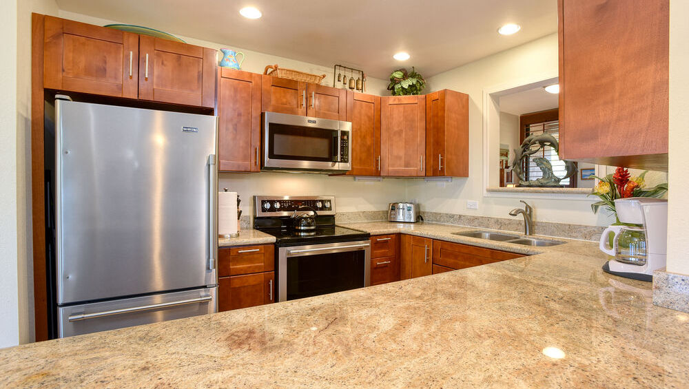 The newly renovated pavilion is a fantastic place to relax, take a swim, prepare a meal, and eat. The pavilion features a full kitchen with a stove, multiple ovens, multiple grills, fridges, freezers, water dispenser, and ice maker. There is a large TV available for use as well. The pool has plenty of room for you to swim in, and the poolside has multiple lounge chairs and umbrellas if you just want to relax. Next to the bathrooms is an outdoor shower if you need to rinse off. Want to take a swim in the ocean? Just go through gate down to Keawakapu Beach. Here you can swim and even do some snorkeling. Just outside of the pavilion area is a great snorkeling spot with all types of fascinating fish and maybe a turtle will make an appearance.