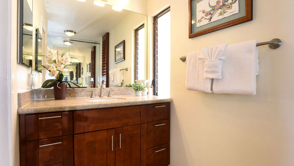 This charming 2 bed, 2 bath unit is located on the second floor allowing it to have a view of the ocean from the lanai, dining room, and master bedroom. The kitchen is stocked with all the basic appliances you may need during your stay, including a toaster, blender, coffee maker, and rice cooker. Both the dining room and lanai have table seating for meals, and the living room has plenty of comfortable seating for a relaxing evening. The guest bedroom features one twin bed, one full size bed, a desk, its own lanai facing towards a garden view, a closet and its own bathroom. In the master, you’ll find a place of solitude. It has its own lanai with a view of the ocean, a closet, dresser, and a lovely stone inlaid walk-in shower. Each room has a TV and its own air conditioning unit, and the unit has its own washer and dryer within.